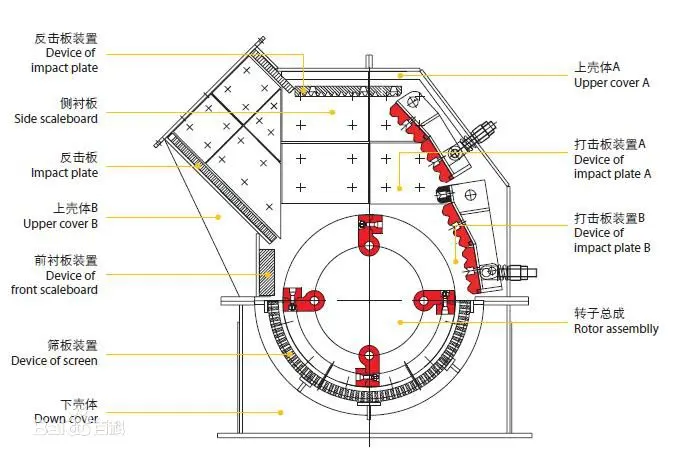 Құрылым қарапайым және корпус, ротор және әсерлі тақтайшадан тұрады. Әсер етуді ұсатқыштың негізгі жұмыс бөлігі - бұл тақтайша балғалары бар жылдам айналатын ротор. Имперациялау процесінде, материалдық блоктар бір-бірімен соқтығысқан. Материал пластиналы балғамен соғылған сайын, әсерлі плитаның және соқтығысудың бір-бірінің арасындағы соқтығысу, жарықтар мен қопсытулар үнемі пайда болады, ол әдетте ұсақтауға әкеледі. Әсер ету құрылғысы пластиналы балғамен соққыға төтеп беру үшін қолданылады және оны қалпына келтіреді. Негізгі компонент - бұл болат тақтайшалармен дәнекерленген әсер тақтасы. Оның әсері бетіне тозуға төзімді төсемелер бар, ал кейбіреулері әсерлі және торлы тақтайшалар немесе торлы тақтайшалар бар.